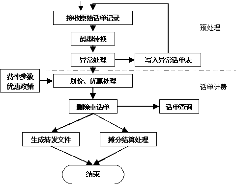 區(qū)域計費(fèi)中心從交換機(jī)實(shí)時/定時采集原始話單數(shù)據(jù),它是整個系統(tǒng)的起始點(diǎn),也是系統(tǒng)其它部分的基礎(chǔ)。其性能直接影響整個系統(tǒng)的運(yùn)行效果。對該模塊要求穩(wěn)定可靠、處理靈活。 “八國九制”意味著,一個好的計費(fèi)采集系統(tǒng),必然要求它能夠處理多種交換機(jī)格式。比如EWSD、S1240、5ESS等等。 在采集所用網(wǎng)絡(luò)傳輸協(xié)議上,一般要求系統(tǒng)支持X.25/FTAM、X.25/CMIP等協(xié)議。 2.計費(fèi)結(jié)算 采集機(jī)從交換機(jī)上采集下來原始話單文件,該類文件是BCD碼文件,需要進(jìn)行碼型轉(zhuǎn)換,變成ASCII碼文件,為后續(xù)的計費(fèi)處理創(chuàng)造條件。 話單格式轉(zhuǎn)換:話單格式轉(zhuǎn)換從交換機(jī)下載的二進(jìn)制信息中提取用于計費(fèi)和統(tǒng)計的信息,并從二進(jìn)制格式轉(zhuǎn)換為文本格式。但是由于上面提到的原因,國內(nèi)交換機(jī)種類比較多,各種交換機(jī)的數(shù)據(jù)格式都不相同,即使是相同的交換機(jī),由于需要版本升級,也會對數(shù)據(jù)格式產(chǎn)生影響。假如預(yù)處理模塊不能靈活地處理各種格式的文件,則勢必會對電信服務(wù)商的投資造成浪費(fèi)。國創(chuàng)公司在話單預(yù)處理中,提供了一種“自定義話單格式”方式,用戶可以根據(jù)自己交換機(jī)的數(shù)據(jù)格式進(jìn)行配置,而預(yù)處理模塊不需進(jìn)行修改。即可以適應(yīng)當(dāng)前多種交換機(jī)并存的局面,又可以適應(yīng)未來交換機(jī)版本升級的需求,極大地保護(hù)了用戶的投資。 計費(fèi)劃價處理: 計費(fèi)計算模塊根據(jù)話單中記錄的起始時間、通話時長、對端號碼等信息在資費(fèi)策略庫中查找滿足條件的費(fèi)率極其優(yōu)惠策略。從而計算出此次通話應(yīng)向用戶收取的基本費(fèi)用。特別地,考慮到業(yè)務(wù)的發(fā)展與變化,系統(tǒng)可對費(fèi)用中的各項(xiàng)子費(fèi)用單獨(dú)計算,并能夠適應(yīng)新的優(yōu)惠策略的增加。整個計費(fèi)流程如下:
