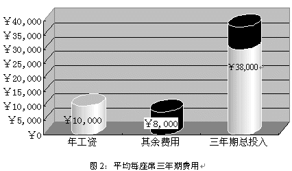 就中國目前的經(jīng)濟(jì)水平而言,一個(gè)座席人員年收入(包括工資、獎(jiǎng)金、福利等等)大約為¥10,000,而每個(gè)座席人員所配備的軟硬件設(shè)施合計(jì)約為¥5,000;據(jù)專業(yè)機(jī)構(gòu)統(tǒng)計(jì),中國的座席人員平均穩(wěn)定的工作年限為三年,而在這三年為了保證座席人員能夠準(zhǔn)確、高效的實(shí)現(xiàn)對用戶提供專業(yè)服務(wù),所投入的培訓(xùn)費(fèi)用大約為¥3,000。所以在三年期間為每個(gè)座席的平均花費(fèi)為¥38,000。