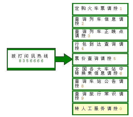 應(yīng)用訊飛語音技術(shù)的鄭州火車站電話問訊系統(tǒng),不僅規(guī)模比原有系統(tǒng)擴(kuò)大一倍,而且服務(wù)內(nèi)容更加豐富,提供實(shí)時(shí)更新的信息,真正實(shí)現(xiàn)了對(duì)旅客的個(gè)性化服務(wù)。下圖所列即該自動(dòng)電話問訊熱線主要功能: