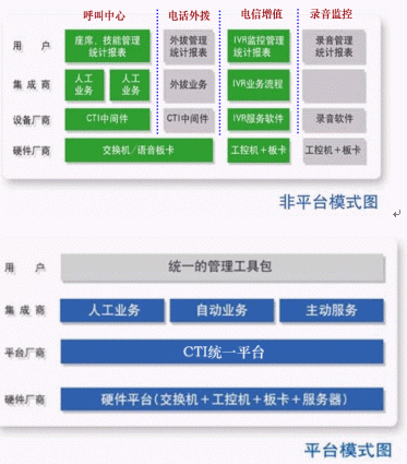 非平臺模式的系統(tǒng)建設(shè)需要采用多家設(shè)備,如不同廠家的交換機、語音板卡、CTI中間件、IVR服務(wù)軟件、錄音設(shè)備,以及相互獨立的、沒有統(tǒng)一設(shè)計的系統(tǒng)維護(hù)工具和業(yè)務(wù)界面。而平臺模式的系統(tǒng)建設(shè)只需要采用一家的設(shè)備,各業(yè)務(wù)模式在一個平臺上實現(xiàn),具備統(tǒng)一的管理工具。