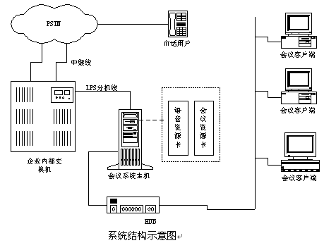 說明:如果沒有企業(yè)內部程控交換機則可以將中繼線直接接在會議系統(tǒng)主機上,中繼線可以是普通模擬中繼,也可以是E1接口(如中國一號信令、30B+D等)。在與會議系統(tǒng)主機的同一網(wǎng)段上可以配置多個會議客戶端系統(tǒng),通過客戶端系統(tǒng)用戶可以隨時觀察和監(jiān)視會議系統(tǒng)的使用情況,并且可以建立常用用戶的用戶資料,也可以對常用用戶進行分組,這樣要呼叫某些用戶開會時只需呼叫組用戶即可;
