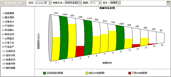 如果缺乏可預(yù)見的銷售進(jìn)程管理,企業(yè)的銷售目標(biāo)將難以順利實現(xiàn);手工的、基于結(jié)案的銷售收入統(tǒng)計造成的滯后性,降低了企業(yè)靈活應(yīng)對復(fù)雜多變市場的能力。幸好,CRM軟件提供了一套經(jīng)典的銷售進(jìn)程可視化管理工具,它包括銷售管道圖和銷售預(yù)測圖等。