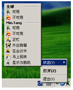 用戶可以點(diǎn)擊“設(shè)置狀態(tài)”工具欄的上圖標(biāo)或是點(diǎn)擊右下角“系統(tǒng)托盤”中的圖標(biāo)來(lái)設(shè)置自己的工作狀態(tài)。