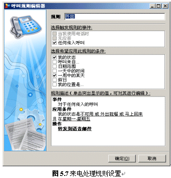 用戶可以設置一個或多個來電處理規(guī)則,來電處理規(guī)則能夠協(xié)助用戶處理來電,讓客戶得到最好的電話支持或服務。我們可以這么使用此功能,如:外出時將所有來電轉至語音信箱,節(jié)假日時將電話轉至手機等。