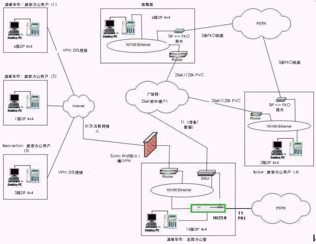 系統(tǒng)的安裝是由蘇迪思科技公司的認(rèn)證增值分銷商Xiologix 來實(shí)現(xiàn)的。在45分鐘內(nèi)Xiologix 的工程師就設(shè)定和調(diào)試完畢MX250并且完成了第一期20部蘇迪思ZIP4x4 IP電話的安裝。一個(gè)月后Consani Associates公司又進(jìn)行了系統(tǒng)擴(kuò)展追加了30個(gè)用戶許可和另外30部ZIP4x4 IP電話。Consani Associates 公司采用蘇迪思科技的MX250系統(tǒng)后的公司系統(tǒng)網(wǎng)絡(luò)拓樸圖如下: