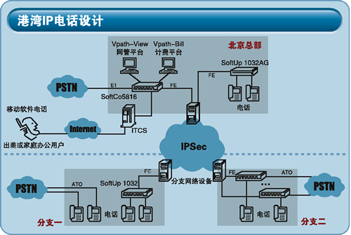港灣網(wǎng)絡(luò)的IP電話系統(tǒng)是一個(gè)基于MGCP協(xié)議的IP電話系統(tǒng),由總部放置Softco5816語(yǔ)音交換機(jī)(主要功能是媒體網(wǎng)關(guān)控制器和部分媒體網(wǎng)關(guān)功能),用于接入用戶電話終端的Softup系列接入網(wǎng)關(guān)和軟電話系統(tǒng)(針對(duì)移動(dòng)用戶和遠(yuǎn)程辦公用戶)構(gòu)成。提供了計(jì)費(fèi)、管理軟件,以及基于軟件方式的話務(wù)臺(tái)。