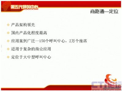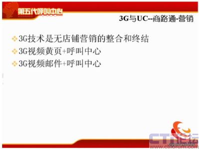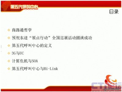 2009年3月37日,商路通參與的東進(jìn)“領(lǐng)點(diǎn)行動(dòng)”北京會(huì)議上,黃河先生做了題為“第五代呼叫中心與3G”的主題報(bào)告,報(bào)告亮點(diǎn)主要包括: