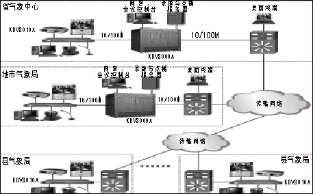 每個(gè)縣氣象局各部署一臺(tái)KDV8010A高清晰視頻會(huì)議終端,通過以太網(wǎng)接入到上級(jí)地市氣象局的KDV8000A多點(diǎn)控制單元。