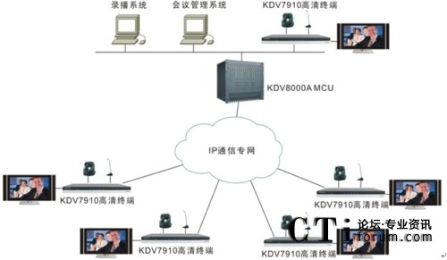各會(huì)場配置KDV7910高清視頻終端,該終端是業(yè)內(nèi)第一款真正支持1080P的高清視頻會(huì)議終端,具有非凡的畫面質(zhì)量、音頻效果和卓越的雙流協(xié)作能力。各終端與中心點(diǎn)MCU之間通過全省財(cái)政IP通信專網(wǎng)相連。