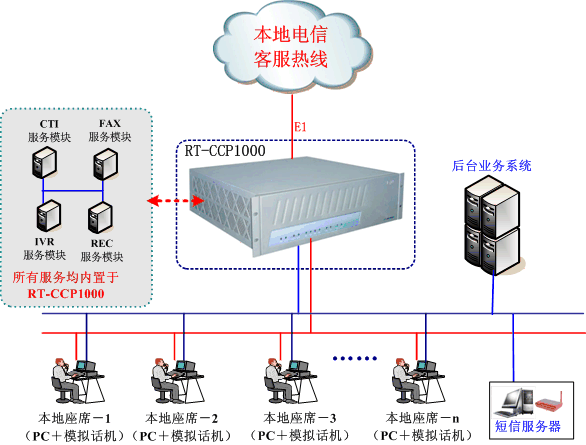系統(tǒng)架構(gòu)簡(jiǎn)單,CIT服務(wù)模塊、傳真服務(wù)模塊、IVR服務(wù)模塊、錄音服務(wù)模塊都內(nèi)置在RT-CCP1000內(nèi),從電信運(yùn)營商接入1條數(shù)字中繼E1到RT-CCP1000,RT-CC1000提供20個(gè)人工座席10路VIR,同時(shí)支持語音、留言、傳真、短信、郵件方式,為申銀萬國客戶提供全方位的服務(wù)模式;提供業(yè)務(wù)系統(tǒng)接口與申銀萬國后臺(tái)業(yè)務(wù)系統(tǒng)無縫整合,實(shí)現(xiàn)呼叫中心系統(tǒng)與業(yè)務(wù)系統(tǒng)的緊密結(jié)合;為申銀萬國量身定制多款個(gè)性化的工單。維護(hù)界面采用全中文WEB方式,支持遠(yuǎn)程維護(hù),同時(shí)也支持遠(yuǎn)程座席方式,為后續(xù)公司的發(fā)展打下了堅(jiān)實(shí)的基礎(chǔ)。