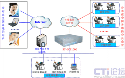 融天科技采用自主研發(fā)的融合通信平臺(tái)RT-CCP1000設(shè)備一套為奇旅網(wǎng)部署了一套Web-call聯(lián)絡(luò)中心。RT-CCP1000集傳統(tǒng)PBX、IP-PBX、CTI、IVR、DB、VOIP、錄音、傳真等服務(wù)于一體,以模塊化的形式提供用戶所需的各種功能,是一套功能強(qiáng)大的一體化融合通信平臺(tái),安裝部署非常方便,維護(hù)管理非常簡單。該方案中,與本地電信運(yùn)營商采用數(shù)字中繼E1接口和模擬中繼FXO接口方式連接,軟電話以控件方式嵌入到奇旅網(wǎng)公司的商務(wù)網(wǎng)站上, RT-CCP1000將接收所有以該控件方式來至Internet來的呼叫,并通過與電信運(yùn)營商接口呼叫相關(guān)會(huì)員企業(yè)綁定的聯(lián)絡(luò)電話,這樣就實(shí)現(xiàn)了上網(wǎng)用戶通過電腦與會(huì)員企業(yè)免費(fèi)進(jìn)行直接聯(lián)絡(luò)。網(wǎng)絡(luò)拓?fù)鋱D如下: