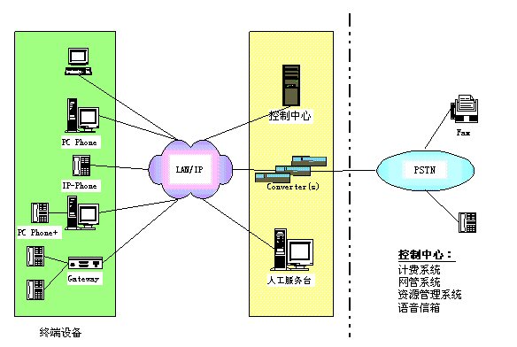 控制中心:包括資源管理系統(tǒng)、計費系統(tǒng)、網管系統(tǒng)、語音信箱。 其中,資源管理系統(tǒng)主要執(zhí)行地址翻譯、權限控制、路由管理等功能;計費系統(tǒng)主要完成計費及結算功能;網管系統(tǒng)完成對網絡及IP