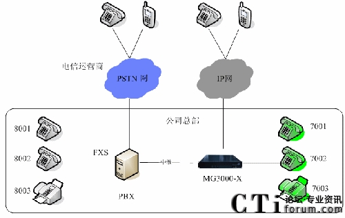 在公司總部增加一臺IPPBX(MG3000-X),通過中繼線與原有的PBX系統(tǒng)互聯(lián),在IPPBX上開通分機(7XXX), 新增員工的分機: