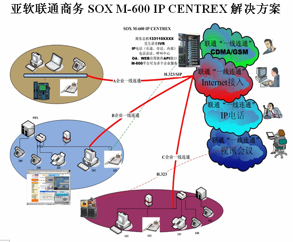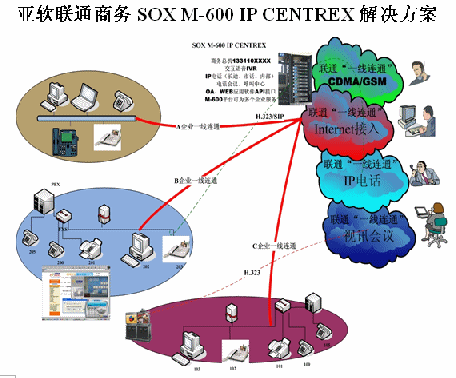 亞軟SOX融合通信解決方案也叫聯通商務解決方案,該方案是基于軟交換的可為多個集團用戶提供IP語音解決方案。SOX融合通信解決方案為集群用戶提供了區(qū)別于傳統(tǒng)集團內部、外部的通信方式,集團無需再購置PBX及為其支付維護費用。由于SOX融合通信解決方案是置于IDC托管中心并基于IP軟交換技術,所以沒有地域限制,具有集群性、可移動性等IP通信特征。