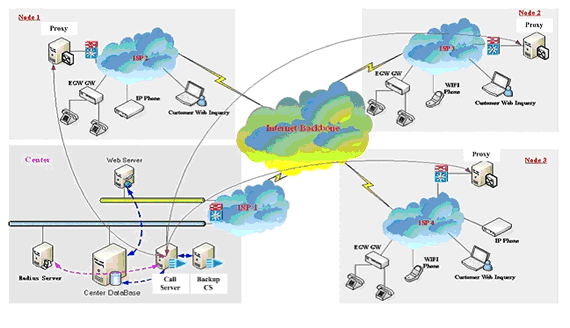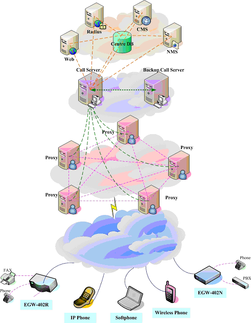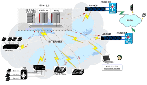 無論大型企業(yè)用戶(通過PBX接入網(wǎng)關設備)、小型企業(yè)用戶(使用網(wǎng)關設備)還是其它使用單口網(wǎng)關或IP Phone的用戶,都可以通過各種接入方式接入到ECM3.0網(wǎng)絡中,并通過PROXY及MEDIA