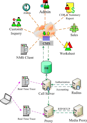 系統(tǒng)管理員通過Web和CMS對用戶進行管理,并通過CS和PROXY所帶的網(wǎng)管功能(NMS)進行實時的網(wǎng)絡監(jiān)控及維護,及時診斷并處理故障。