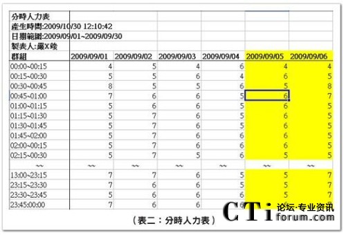 分時(shí)人力表在管理上有重要的地位,用于檢視時(shí)間內(nèi)排定的出席人數(shù),通常是將此數(shù)據(jù)與預(yù)測(cè)的話務(wù)需求做比對(duì),檢查排定人力數(shù)與話務(wù)曲線的擬合度。在現(xiàn)場(chǎng)管理時(shí),則用于小休調(diào)度,避免小休人數(shù)過多,使出席人數(shù)降到關(guān)鍵少數(shù)的臨界點(diǎn)下,造成服務(wù)水平大幅跌落的狀況發(fā)生。