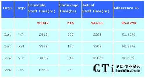 提供經(jīng)過異常撫平與班表結(jié)算過后的遵時(shí)率,通常做為考核評(píng)比的重要項(xiàng)目之一,此報(bào)表是呼叫中心用來管理人員績(jī)效的重要資料來源。