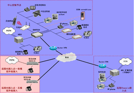 IPPBX將成為企業(yè)辦公不可缺少的一部分。此方案適合于已經(jīng)有PBX的公司,由于先期已經(jīng)投入了PBX設(shè)備,費(fèi)用昂貴,所以不會輕易被替換。在外地有多家分公司,使用傳統(tǒng)電話通訊費(fèi)用很高,希望能降低成本。并希望在分公司所在城市可以通過當(dāng)?shù)氐腜STN落地,節(jié)省長途費(fèi)用。依照客戶的需求,我們制定了以下方案: