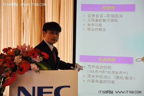 2011年3月28日,國(guó)際通信行業(yè)巨頭日本電氣株式會(huì)社(以下簡(jiǎn)稱NEC公司)在北京舉辦新品發(fā)布會(huì),宣布最新智能通訊服務(wù)器SL1000正式上市。發(fā)布會(huì)上,NEC公司IT網(wǎng)絡(luò)國(guó)際解決方案組平臺(tái)事業(yè)部副總裁橋沢太一郎先生闡述了對(duì)未來(lái)中國(guó)市場(chǎng)的市場(chǎng)策略和遠(yuǎn)景目標(biāo)。