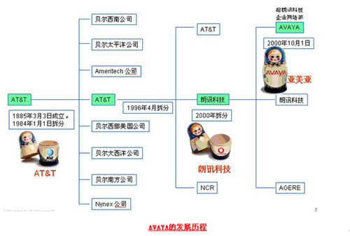 Avaya的歷史最早可以追溯到1885年成立的美國電話電報公司(AT&T),AT&T在1994年一分為AT&T、朗訊科技、NCR等三家公司,而Avaya于2000年10月從朗訊科技的企業(yè)通信部門剝離獨立上市(代碼AV),再后來即上文中提到的Avaya被兩大私募德州太平洋集團(tuán)和銀湖合伙組成的財團(tuán)用82億美元私有化。