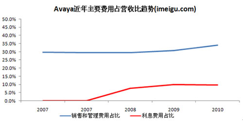 銷售和管理費用以及利息費用是Avaya開支最大的兩塊費用,管理和銷售費用一直穩(wěn)定在30%左右。Avaya私有化之前的2006、2007財年的利息費用分別為300萬美元、100萬美元(對應(yīng)著51.48億美元和52,78億美元的營收),利息費用占比不到1%,私有化之后利息費用急劇飆升(私有化相關(guān)債務(wù)的增加),2008、2009、2010財年利息費用分別為3.77億美元、4.09億美元、4.87億美元,成為束縛Avaya盈利的關(guān)鍵因素。