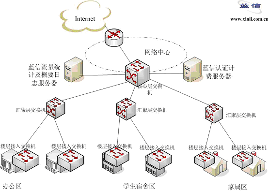 在網(wǎng)絡(luò)中心機(jī)房部署“藍(lán)信認(rèn)證計(jì)費(fèi)系統(tǒng)”,藍(lán)信認(rèn)證計(jì)費(fèi)系統(tǒng)除支持標(biāo)準(zhǔn)的RADIUS協(xié)議外,還支持領(lǐng)先的802.1x協(xié)議,通過(guò)與各接入層交換機(jī)的配合,實(shí)現(xiàn)了認(rèn)證管理功能。通過(guò)綁定帳號(hào)、IP、MAC地址等15元素,真正保證只有合法用戶(hù)才能通過(guò)認(rèn)證;對(duì)用戶(hù)進(jìn)行分級(jí)權(quán)限管理,可按信用度等級(jí)對(duì)用戶(hù)進(jìn)行劃分,方便了用戶(hù)的管理。此外,在網(wǎng)絡(luò)出口處部署藍(lán)信流量統(tǒng)計(jì)工具,通過(guò)與藍(lán)信認(rèn)證計(jì)費(fèi)系統(tǒng)的配合,實(shí)現(xiàn)對(duì)用戶(hù)按流量來(lái)計(jì)費(fèi),可以把用戶(hù)訪問(wèn)流量按校內(nèi)校外、國(guó)內(nèi)國(guó)際來(lái)區(qū)別對(duì)待,并設(shè)置不同的費(fèi)率。同時(shí),還部署了藍(lán)信概要日志系統(tǒng),有效記錄了用戶(hù)的上網(wǎng)信息,并提供人性化的web客戶(hù)端,方便管理者進(jìn)行事后查詢(xún),有效的控制了網(wǎng)絡(luò)的安全性。