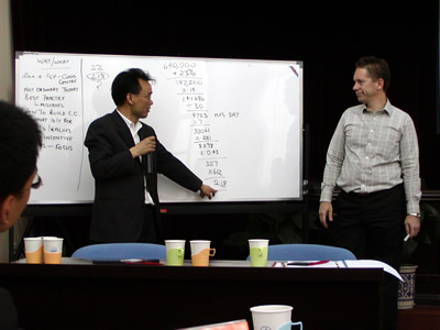 公開課在Simon Kriss先生詼諧的講課風(fēng)格的引導(dǎo)下自始至終在輕松、愉快又不失專業(yè)深度的氛圍中進(jìn)行著,而Simon Kriss先生以呼叫中心運(yùn)營管理的高效率為主題,從呼叫中心的環(huán)境布局、預(yù)測管理、人力資源管理、效率管理到專業(yè)報告形式等知識點上做了專業(yè)深入的講解。尤其在人力資源管理和效率管理方法的傳授時引發(fā)了全體學(xué)員極大的興趣和反應(yīng),例如:就人員附著度的定義及操作問題學(xué)員同講師展開了多倫次的討論。而Simon