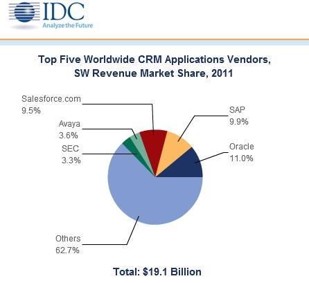 IDC追蹤調(diào)查了超過(guò)190個(gè)分立的CRM供應(yīng)商,發(fā)現(xiàn)他們的總營(yíng)收增長(zhǎng)速率在2011年下半年開(kāi)始減緩。最終,2011年CRM市場(chǎng)營(yíng)收增長(zhǎng)率達(dá)到了11.2%。