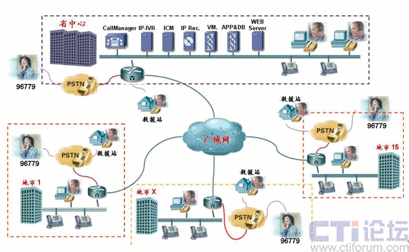 如上圖所示,由于Cisco IPCC是基于標準IP網絡的純IP呼叫中心解決方案,呼叫中心的核心設備都只部署在省中心機房,其它地市只需要在原有網絡的路由器上添加語音模塊即可實現(xiàn)PSTN語音的本地接入,而無需再各地市購買額外的接入設備。而同樣由于IP網絡的特性,呼叫中心的坐席可以根據需要部署在甘肅省運輸管理局IP網絡可達的任何一個地方,各地市的坐席只需要配備IP電話和座席PC即可。來自PSTN的電話根據用戶在IVR中的選擇和其它路由策略,自動分配到最適合的坐席處理,譬如來自白銀的運政投訴由白銀市本地的運政大廳座席人員處理。