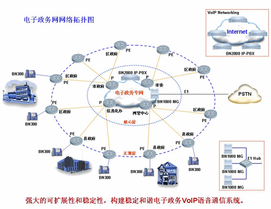 MG和BN2000 IP PBX就可以利用電子政務網(wǎng)自身的優(yōu)勢,實現(xiàn)VoIP語音通信。電子政務網(wǎng)內(nèi)的所有IP電話用戶統(tǒng)一在核心層的BN2000