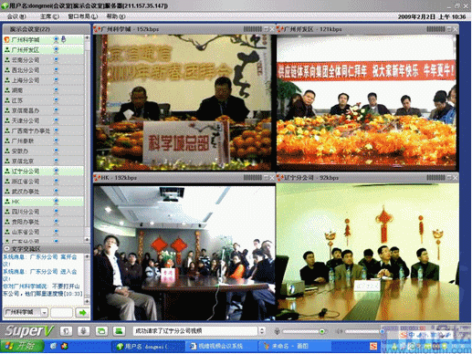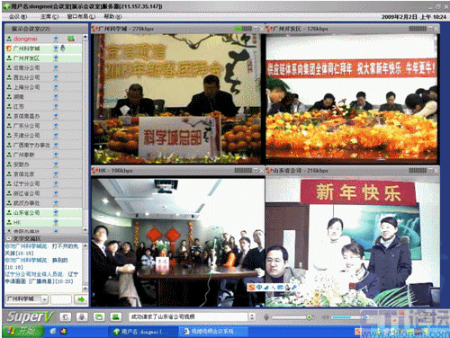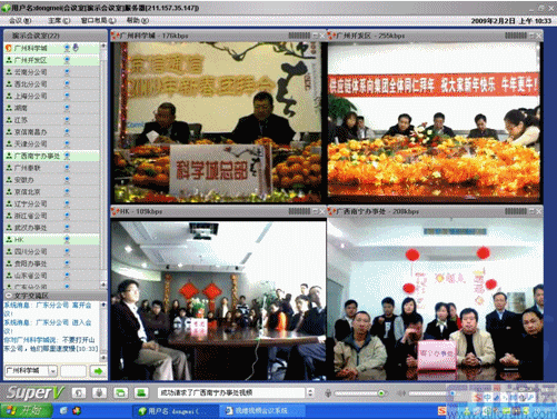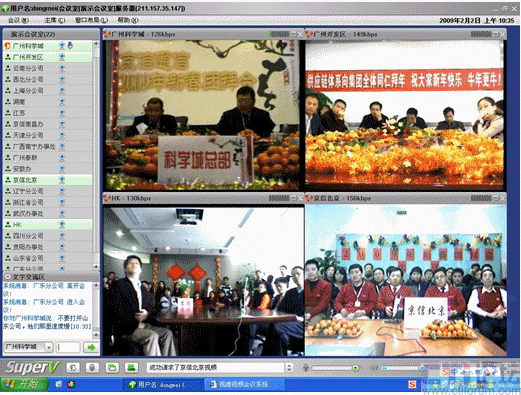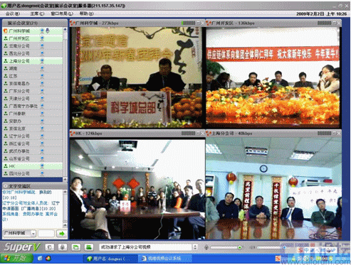 春節(jié)是中華民族的傳統(tǒng)的節(jié)日,尤其是跨國(guó)企業(yè)集團(tuán),身在海外的游子們,這一刻多么期待與在國(guó)內(nèi)的親人、朋友、以及同事網(wǎng)絡(luò)“面對(duì)面”的過(guò)春節(jié);因此,一些企業(yè)用視維視頻會(huì)議舉辦了別開生面的視頻拜年會(huì)。其中京信通信公司視頻年會(huì)尤為精彩,廣州科學(xué)城的主會(huì)場(chǎng)、廣州開發(fā)區(qū)、香港、北京、上海、西北分公司、武漢等20多個(gè)分公司通過(guò)視維視頻會(huì)議互拜大年,通過(guò)網(wǎng)絡(luò)視頻,遠(yuǎn)隔千里一樣可以“面對(duì)面”的送上新春祝福。如下圖: