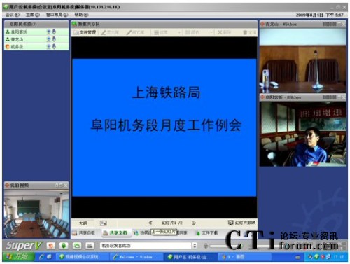 CTI論壇(ctiforum)08月06日消息: 日前,京九干線主力機(jī)務(wù)段——上海鐵路局阜陽(yáng)機(jī)務(wù)段成功啟動(dòng)視維Super-V視頻會(huì)議系統(tǒng)。阜陽(yáng)機(jī)務(wù)段的領(lǐng)導(dǎo)和職工,每天早上8點(diǎn)上班后,第一件事情就是登陸視頻會(huì)議系統(tǒng),匯報(bào)前日工作情況、部署當(dāng)日工作內(nèi)容。已然,山大聯(lián)潤(rùn)為上海路局阜陽(yáng)機(jī)務(wù)段部署的阜陽(yáng)機(jī)務(wù)段視頻會(huì)議系統(tǒng),成為鐵路部門(mén)必不可少的遠(yuǎn)程溝通交流工具,在有效提高鐵路系統(tǒng)溝通效率的同時(shí),保障了鐵路運(yùn)輸?shù)陌踩,極大滿(mǎn)足了鐵路部門(mén)暑期運(yùn)營(yíng)業(yè)務(wù)對(duì)溝通和會(huì)議的需求。