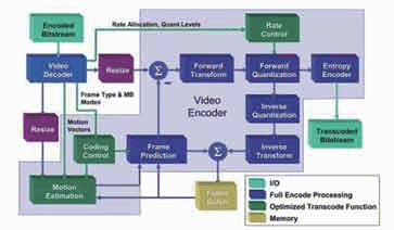 過去幾年來,業(yè)界針對轉碼工作提出了幾種不同的方法,可提高處理與存儲器資源的使用效率。大多數這種方案都建立在這樣一種認識基礎之上,即我們能通過更先進的技術對初始編碼過程中創(chuàng)建的量子化和頻率域信息進行修改,更好地加以利用,摒棄其中無用的東西,而不必簡單地對原始視頻內容進行重構。