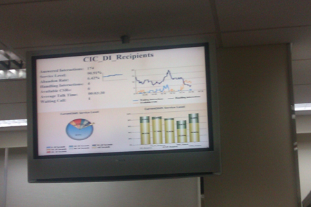 呼叫中心在三樓,在這里有先進(jìn)的軟件系統(tǒng)監(jiān)測(cè)出電話呼入、呼出量、棄線率、平均通話時(shí)長(zhǎng)等各類(lèi)信息并在電視屏幕上實(shí)時(shí)顯示。據(jù)索尼(中國(guó))顧客互動(dòng)中心負(fù)責(zé)人介紹,這是采用的COPC管理體系。