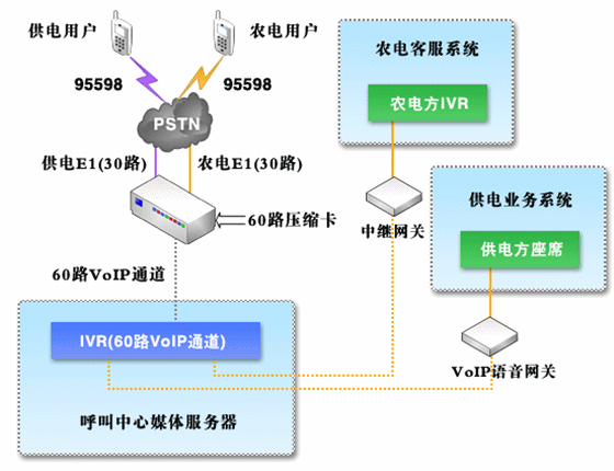 對于呼叫中心系統(tǒng),由95598特別號碼統(tǒng)一接入,并且在供電呼叫中心系統(tǒng)與農(nóng)電呼叫中心系統(tǒng)之間采用中繼方式(模擬中繼或者數(shù)字中繼,視農(nóng)電方實際情況而定)進行話路連接,同時保證系統(tǒng)接入容量及其他資源能夠滿足統(tǒng)一的要求;在自動語音菜單中,分別設立供、農(nóng)電用戶層,用戶可以自行區(qū)分、選擇,對于農(nóng)電用戶在確定用戶類型之后,通過中繼將話路轉接到農(nóng)電方呼叫中心系統(tǒng)。