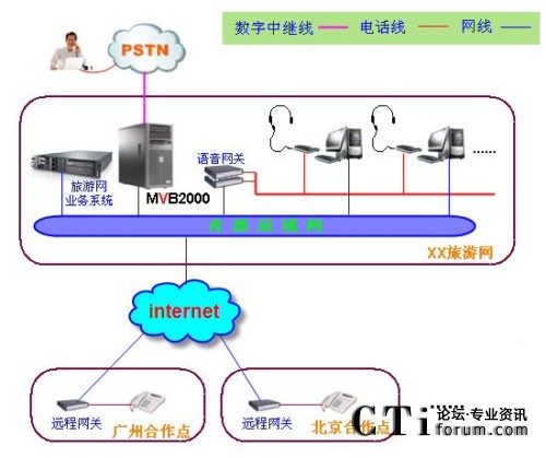在技術(shù)上,旅游網(wǎng)IP呼叫中心解決方案的語(yǔ)音業(yè)務(wù)通過電信運(yùn)營(yíng)商的模擬電話線路(或者模擬中繼線路)接入,數(shù)據(jù)業(yè)務(wù)都通過互聯(lián)網(wǎng)使用TCP/IP協(xié)議傳送,解決了呼叫中心中大量數(shù)據(jù)傳送的需求,請(qǐng)看下面的網(wǎng)絡(luò)組織結(jié)構(gòu)圖: