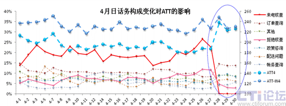 從圖12也可以明顯的看出:ATT“月末彈起”現(xiàn)象的原因同樣是“簡單話務(wù)比例的下降必然帶來整體ATT的上升;復(fù)雜話務(wù)比例的上升也必然帶來整體ATT的上升”;具體因為Avon調(diào)整了業(yè)務(wù)政策,從3月開始,每月27日18:00后至月末NCC不受理來電核查,因此該類話務(wù)從27日的25%左右突降為0;拒絕核查的量比也有-7%的大幅下降(從12%下降到5%以下);而復(fù)雜業(yè)務(wù)如政策咨詢、配送問題則有+6%的較大幅度上升(約從10%上升到16%)。