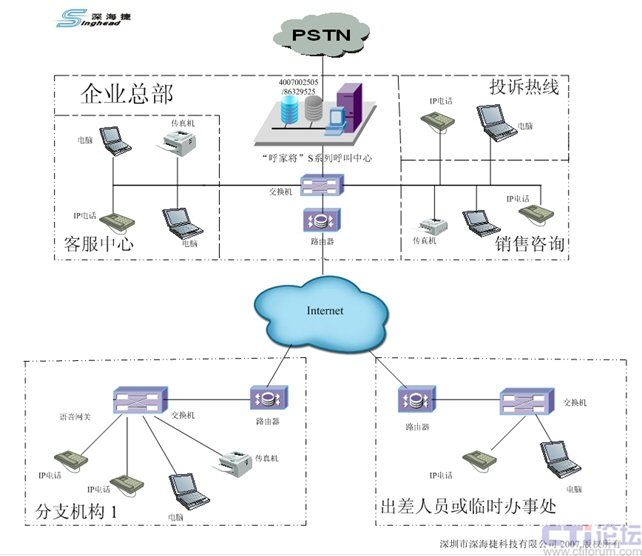 客戶在建設(shè)呼叫中心系統(tǒng)的時候,除了我司提供的呼家將系統(tǒng)外,還需要自行準備公司的內(nèi)部局域網(wǎng)、坐席的終端電腦。如果需要提供遠程坐席,那么還應(yīng)該為呼家將服務(wù)器提供互聯(lián)網(wǎng)連接(配置ADSL+路由器即可)。另外,呼家將系統(tǒng)支持多個呼叫中心服務(wù)器的協(xié)同工作,從而實現(xiàn)客戶各地分支機構(gòu)的協(xié)作運營。