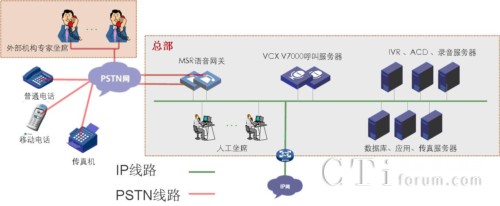 設(shè)備介紹:H3C VCX V7005完成呼叫處理;結(jié)合網(wǎng)音中間件軟件完成自動(dòng)語(yǔ)音應(yīng)答、人工智能排隊(duì)、錄音、話務(wù)統(tǒng)計(jì)輸出等功能;MSR語(yǔ)音網(wǎng)關(guān)完成PSTN落地功能。