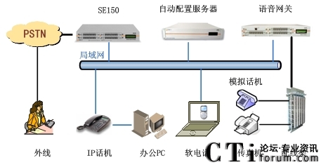 此方案適用于已經(jīng)部署了傳統(tǒng)PBX的企業(yè)。要求企業(yè)部署好數(shù)據(jù)網(wǎng)絡(luò),如果采用模擬終端,則企業(yè)的各個(gè)辦公點(diǎn)需要先將網(wǎng)絡(luò)線(xiàn)路和電話(huà)線(xiàn)路部署到位,同時(shí)企業(yè)原有的PBX要預(yù)留與SE150對(duì)接的接口。
