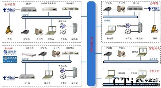 分布式部署:總部和各分支機(jī)構(gòu)的分機(jī),是通過(guò)IP網(wǎng)絡(luò)融合在一個(gè)語(yǔ)音平臺(tái)上來(lái)實(shí)現(xiàn)內(nèi)部通信?偛亢娃k事處分機(jī)、家庭辦公分機(jī)、出差人員的軟電話(huà)均注冊(cè)在總部的SE150上,各分公司的分機(jī)注冊(cè)在本地的SE150上,由本地的SE150管理。