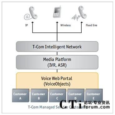 T-Com轉(zhuǎn)向VoiceObjects尋求一個可以管理成百上千應(yīng)用的解決方案,確保對客戶的高可用性和可靠性,并且?guī)椭3脂F(xiàn)有和未來的開發(fā)和更改成本在一個低水平上。在2004年初,T-Com引入了語音Web門戶,一個發(fā)揮了Web基礎(chǔ)架構(gòu)和立足于VoiceObjects服務(wù)器網(wǎng)絡(luò)版本的語音應(yīng)用服務(wù)平臺!拔覀冋趯ふ也粌H能幫助我們開發(fā),而且可以維護和管理我們的自服式電話應(yīng)用的解決方案,”Klindworth說:“當時真的還沒有電話應(yīng)用服務(wù)器公司目錄,但這正是我們需要的:該產(chǎn)品是服務(wù)執(zhí)行平臺,并且以Web應(yīng)用服務(wù)器的方式工作。我們發(fā)現(xiàn)它就是VoiceObjects。”