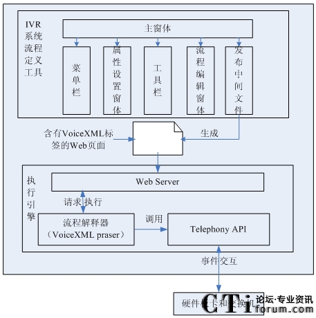 交互式語(yǔ)音應(yīng)答(IVR)系統(tǒng)是電話銀行呼叫中心系統(tǒng)的最前端,它的質(zhì)量直接影響整個(gè)系統(tǒng)的穩(wěn)定性和可擴(kuò)展性。本文設(shè)計(jì)的IVR系統(tǒng)主要分為兩個(gè)模塊:可視化過(guò)程定義工具(用戶交互接口)、流程執(zhí)行引擎。由于過(guò)程定義工具主要是面向用戶,它的設(shè)計(jì)規(guī)范首先要符合流程的定義規(guī)則,反應(yīng)到本文中即流程工具涉及到的節(jié)點(diǎn)類型均符合IVR的操作動(dòng)作和相關(guān)的業(yè)務(wù)動(dòng)作,同時(shí)還要生成符合流程執(zhí)行引擎能處理的文件格式。在流程執(zhí)行引擎方面,符合VoiceXML的設(shè)計(jì)框架,將Web應(yīng)用和語(yǔ)音應(yīng)用相結(jié)合。
