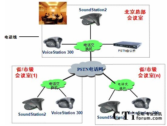 根據(jù)客戶的要求,本著“完善、經(jīng)濟(jì)、高效”的原則,我們制定了以下解決方案;系統(tǒng)利用傳統(tǒng)電話網(wǎng)絡(luò),擁有自己的會議管理系統(tǒng);北京總部方面使用Polycom SS2基本型商務(wù)會議電話;各個省/市級分會場,根據(jù)自己會場的情況自選設(shè)備;