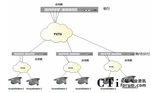 根據(jù)客戶需要在降低會(huì)議成本的前提下實(shí)現(xiàn)快速、便捷、實(shí)時(shí)的多點(diǎn)之間多人會(huì)議溝通的需求,我們制定了以下解決方案;系統(tǒng)利用傳統(tǒng)電話網(wǎng)絡(luò),是客戶擁有自己的會(huì)議管理系統(tǒng);省行方面使用Polycom SS2基本型商務(wù)會(huì)議電話或普通模擬電話;各個(gè)市/縣級(jí)分行,根據(jù)自己會(huì)場的情況自選設(shè)備。