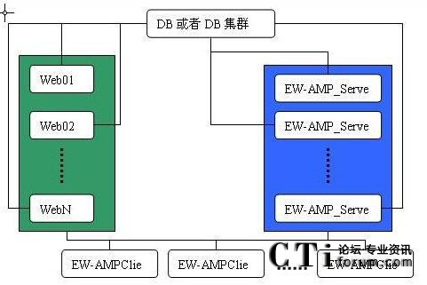 EW-AMP中間件在應用中,可以配置多臺EW-AMP Server服務器由EW-AMP應用集群技術組成EW-AMP Server集群,也可以配置多臺客戶的Web應用(如CRM,MIS等)由EW-AMP