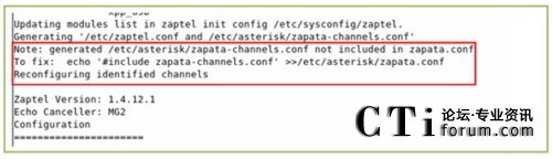 下圖為運(yùn)行上述命令的輸出,從輸出我們可以發(fā)現(xiàn)一個(gè)問(wèn)題,(使用本文的所用的軟件版本可能會(huì)出現(xiàn)的一個(gè)問(wèn)題,其他的版本不一定會(huì)出現(xiàn)),/etc/asterisk/zapata-channels.conf