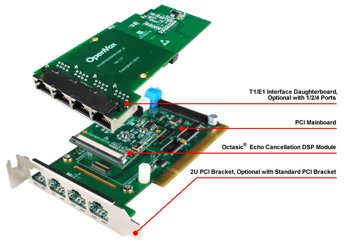 升級版的T1/E1卡可適合于2U機箱。32位33MHz PCI設(shè)計,完全兼容2.3規(guī)格的PCI插槽,自動檢測和識別5V和3.3V PCI主板。先進的FPGA設(shè)計,能在線升級固件,硬件和軟件的升級更新使用更方便。Octasic DSP硬件回聲消除模塊可使每個通道消除回音尾音高達128ms或者1024taps,極大得提高了語音質(zhì)量,又不會增加CPU負載。