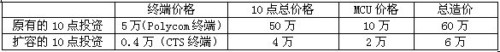 以下列出了原有使用polycom終端的1級(jí)會(huì)議系統(tǒng)和采用CTS方案擴(kuò)容的2,3級(jí)會(huì)議系統(tǒng)投資比較。